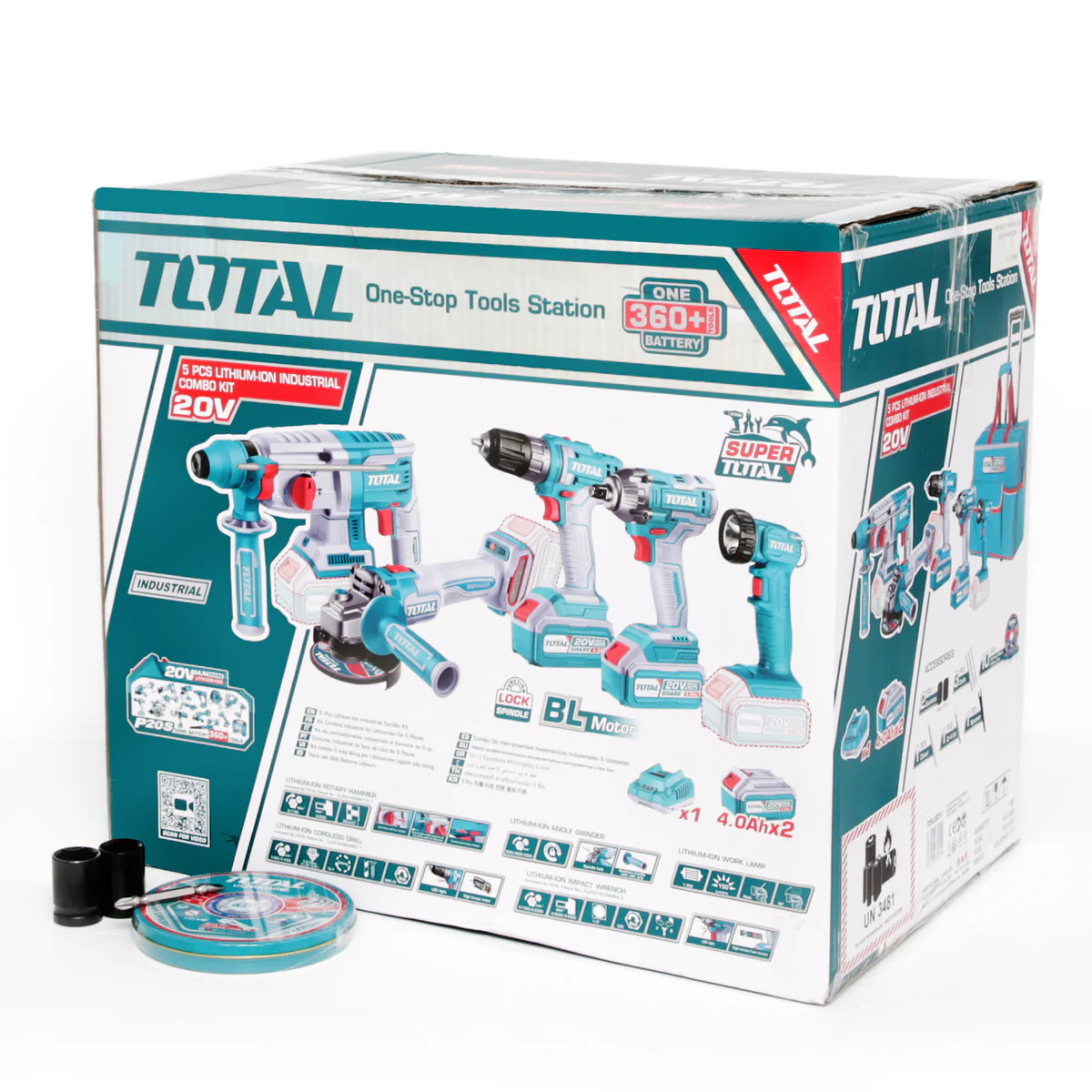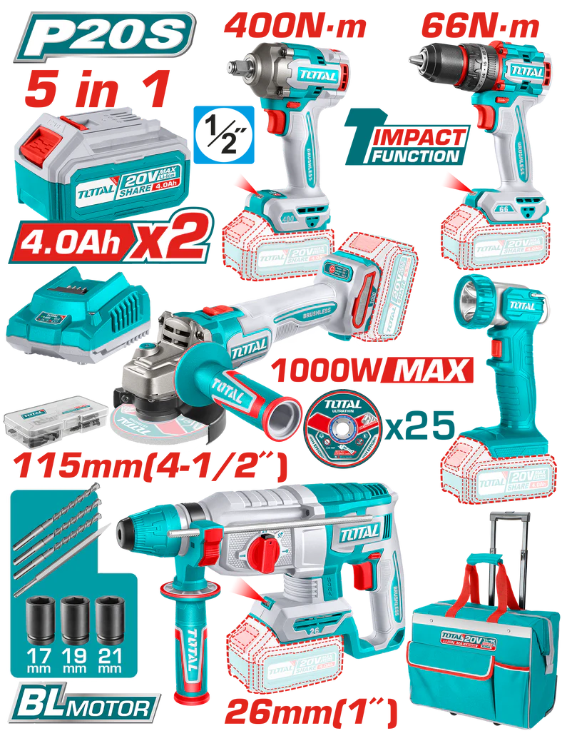 The TOTAL 20V Cordless Industrial Combo Kit TCKLI20592 is your complete portable power station — combining five essential tools powered by the TOTAL 20V Lithium-Ion platform. Built for tradesmen, installers, and contractors who value performance, versatility, and convenience, this kit includes everything you need for cutting, drilling, fastening, grinding, and lighting — all in one industrial-grade package.