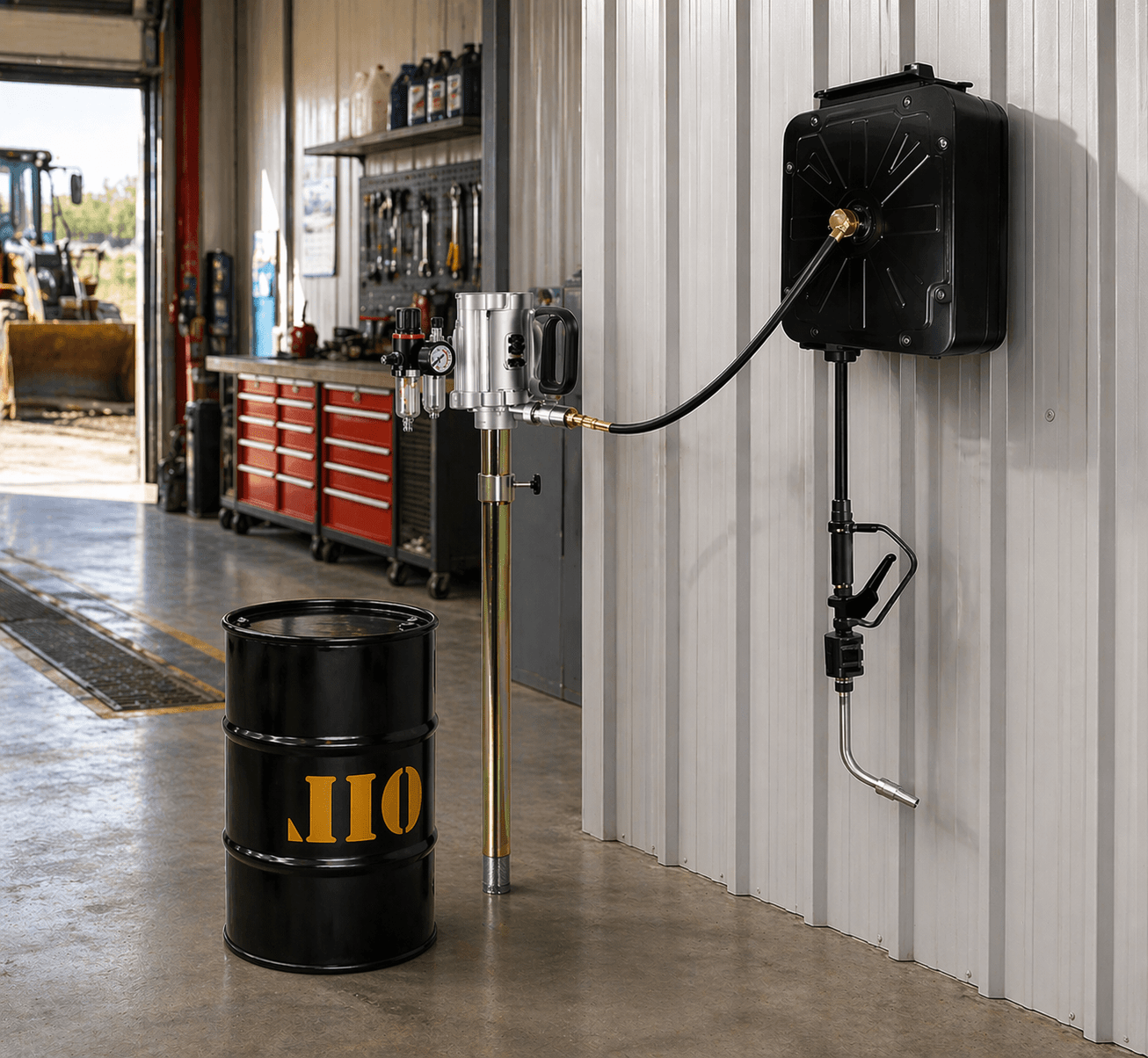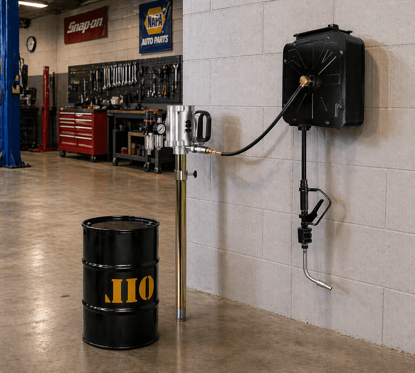 Equipped with a metered flow system, this unit allows technicians to measure oil accurately for each service, improving consistency and operational efficiency. The system supports bulk oil handling, reducing the need for manual pouring and enhancing workplace cleanliness.